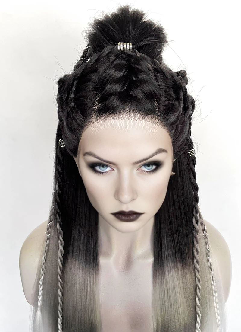 Black Grey White Ombre Braided Yaki Lace Front Synthetic Wig LF2194
